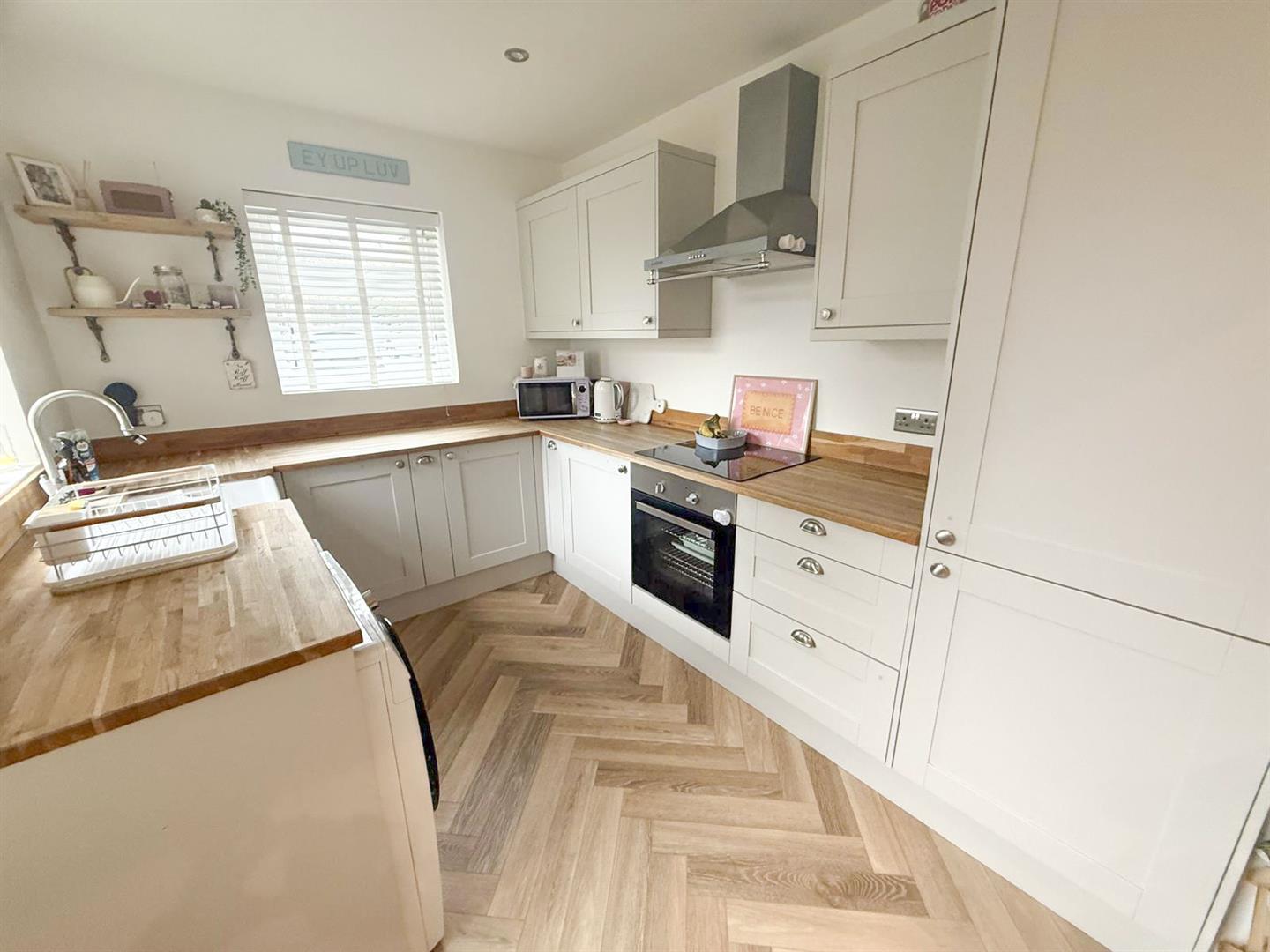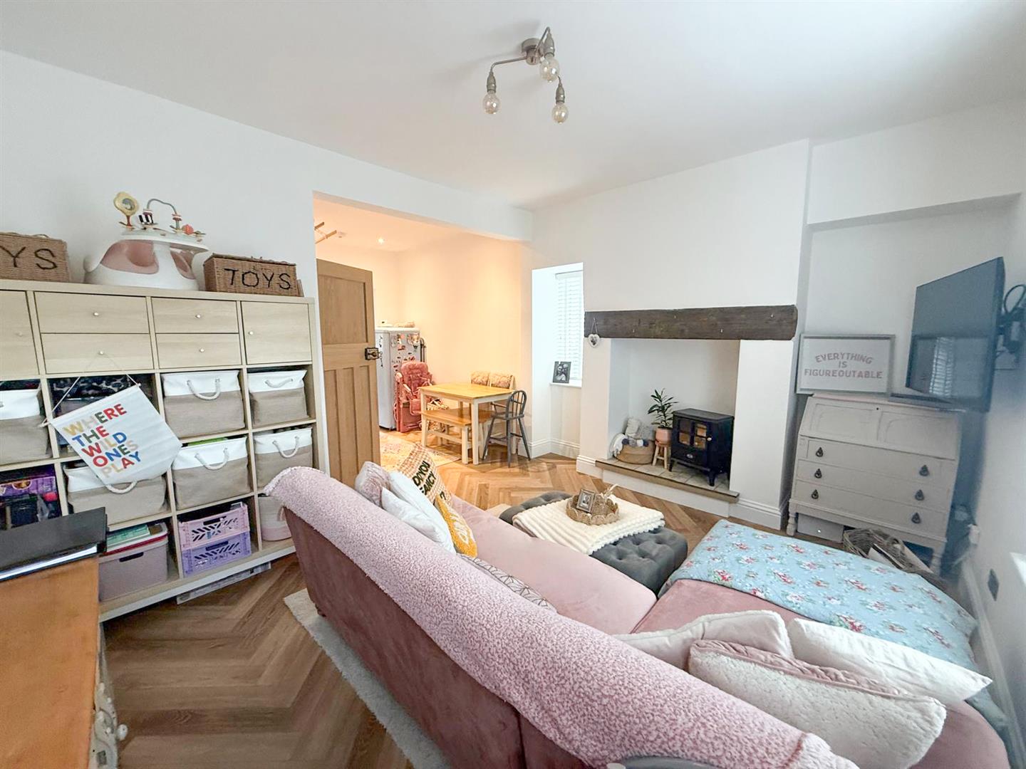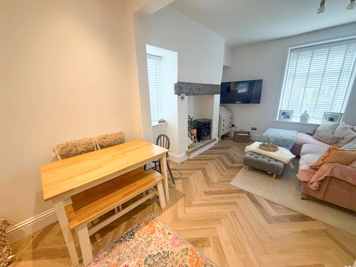 At the heart of the home is a sleek, modern kitchen designed for both everyday living and entertaining, seamlessly flowing into the main living and dining space. The sitting room is full of character, featuring a striking inglenook-style fireplace with a rustic beam above an eye-catching focal point that adds warmth and charm. Natural light floods the interior thanks to windows positioned to the front, rear and side elevations, creating a bright and airy atmosphere throughout. Elegant herringbone-style flooring runs across the ground floor, enhancing the sense of cohesion and contemporary design. An inner hallway with stylish tiled flooring leads to a return staircase rising to the first floor, while a useful keeping cellar provides additional storage space.