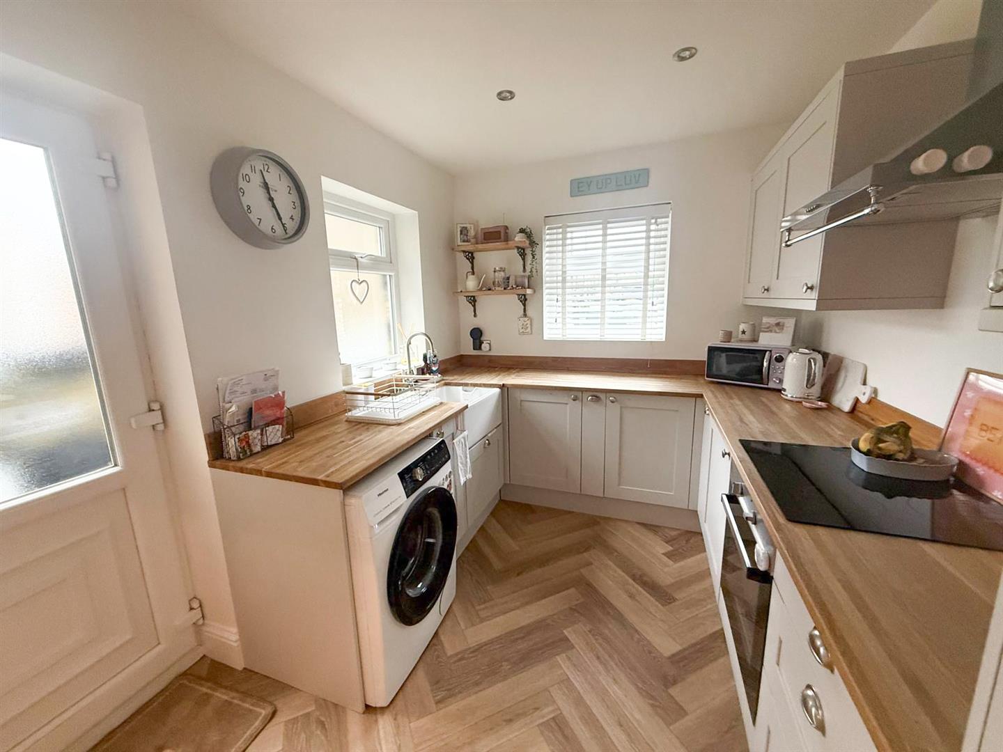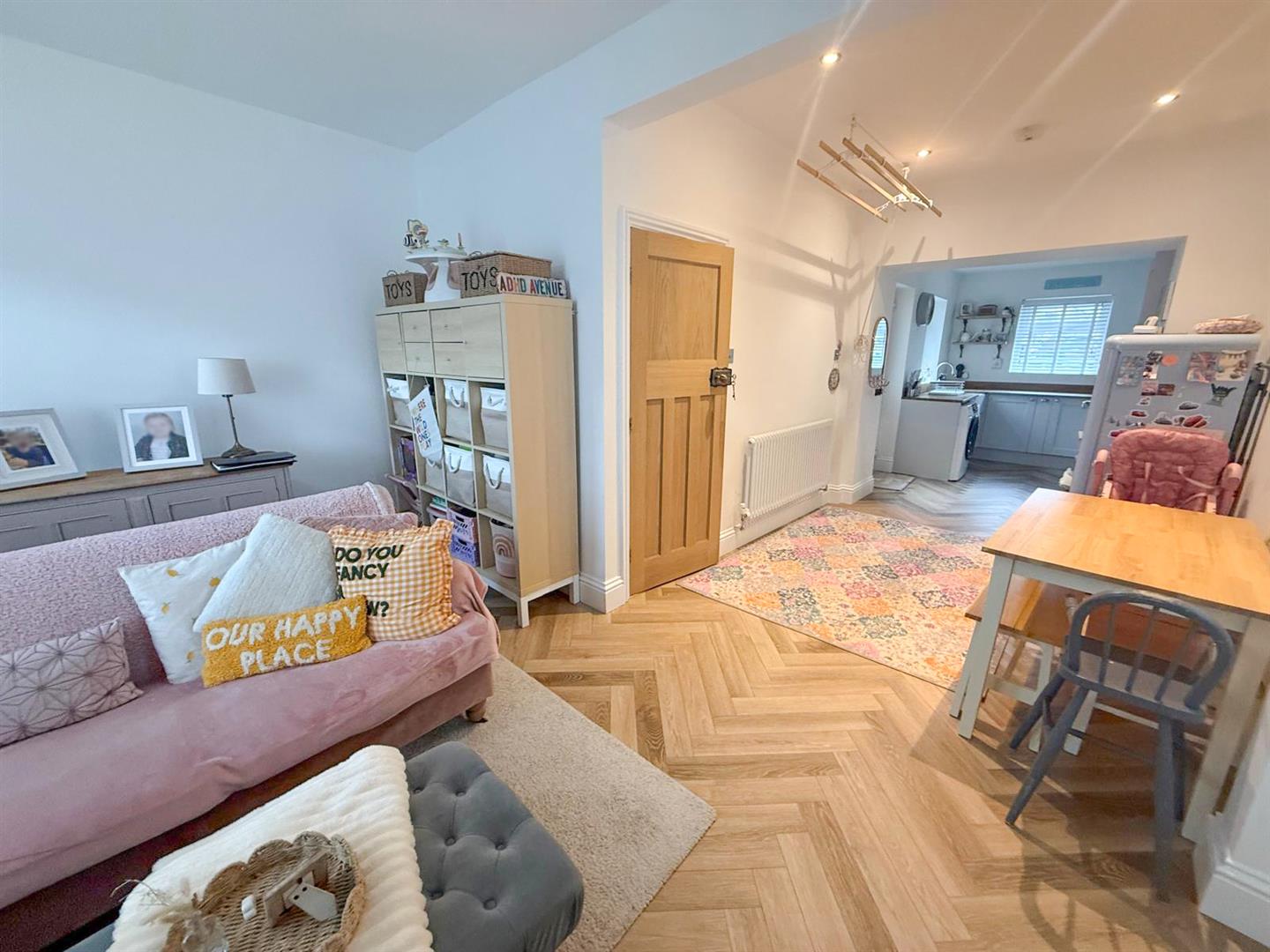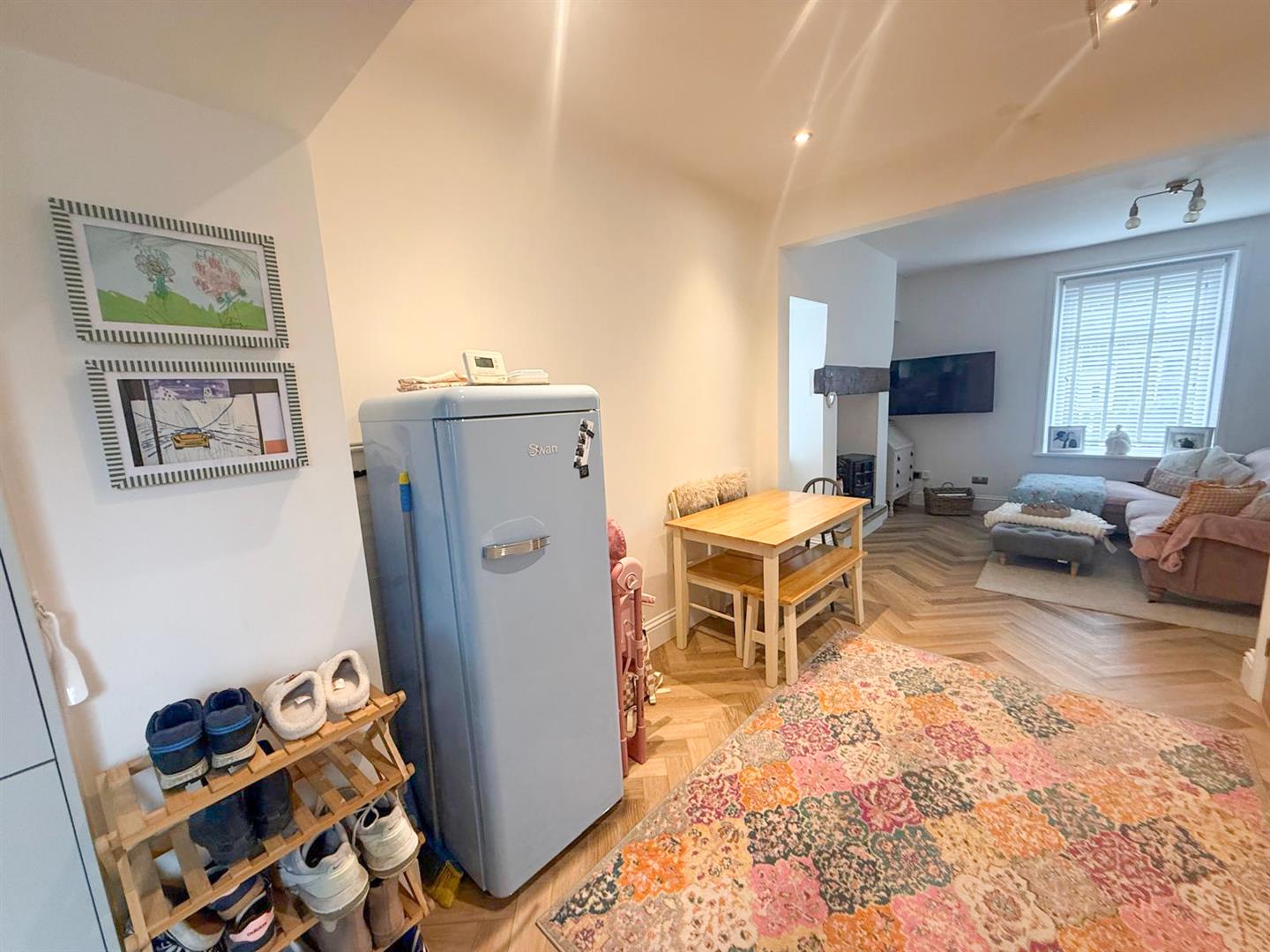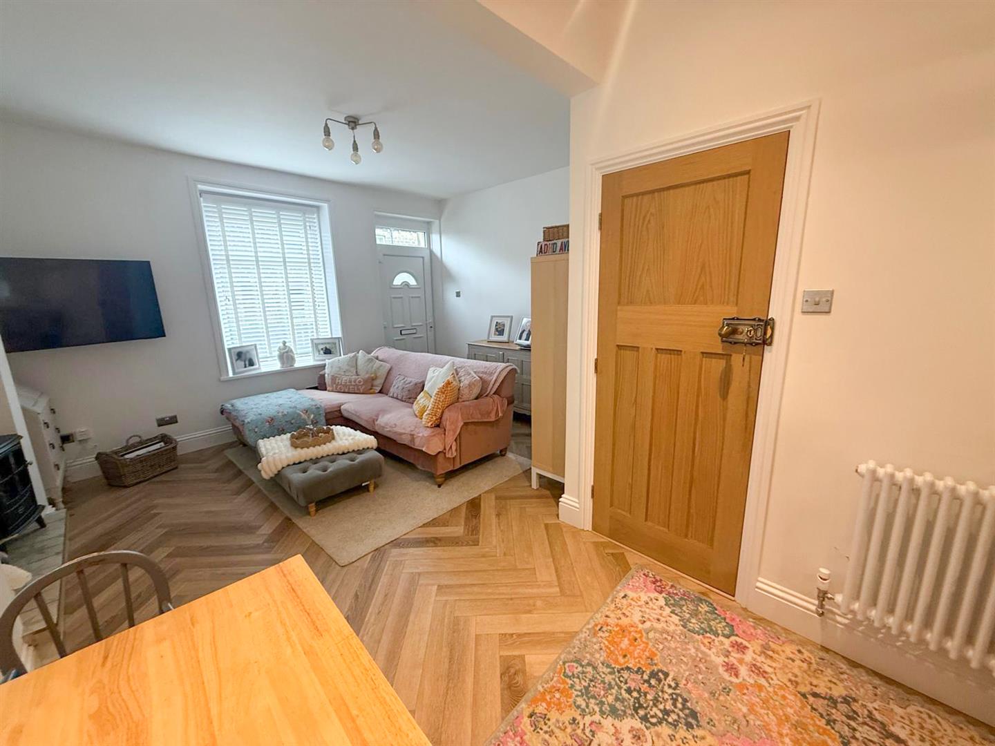At the heart of the home is a sleek, modern kitchen designed for both everyday living and entertaining, seamlessly flowing into the main living and dining space. The sitting room is full of character, featuring a striking inglenook-style fireplace with a rustic beam above an eye-catching focal point that adds warmth and charm. Natural light floods the interior thanks to windows positioned to the front, rear and side elevations, creating a bright and airy atmosphere throughout. Elegant herringbone-style flooring runs across the ground floor, enhancing the sense of cohesion and contemporary design. An inner hallway with stylish tiled flooring leads to a return staircase rising to the first floor, while a useful keeping cellar provides additional storage space.