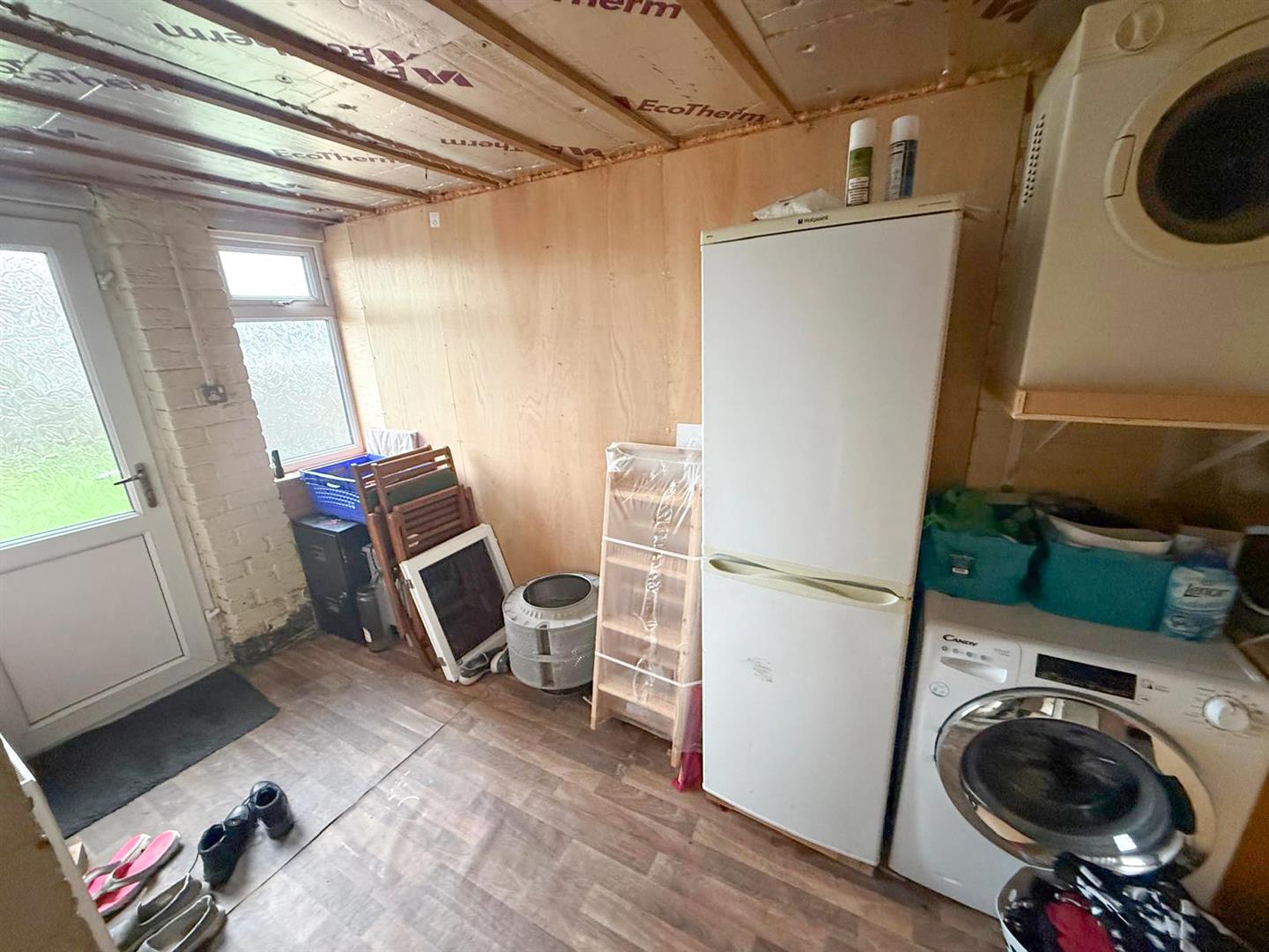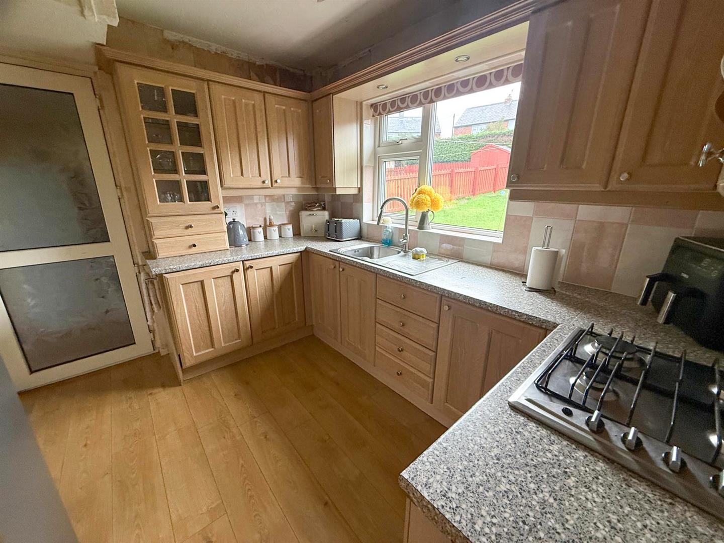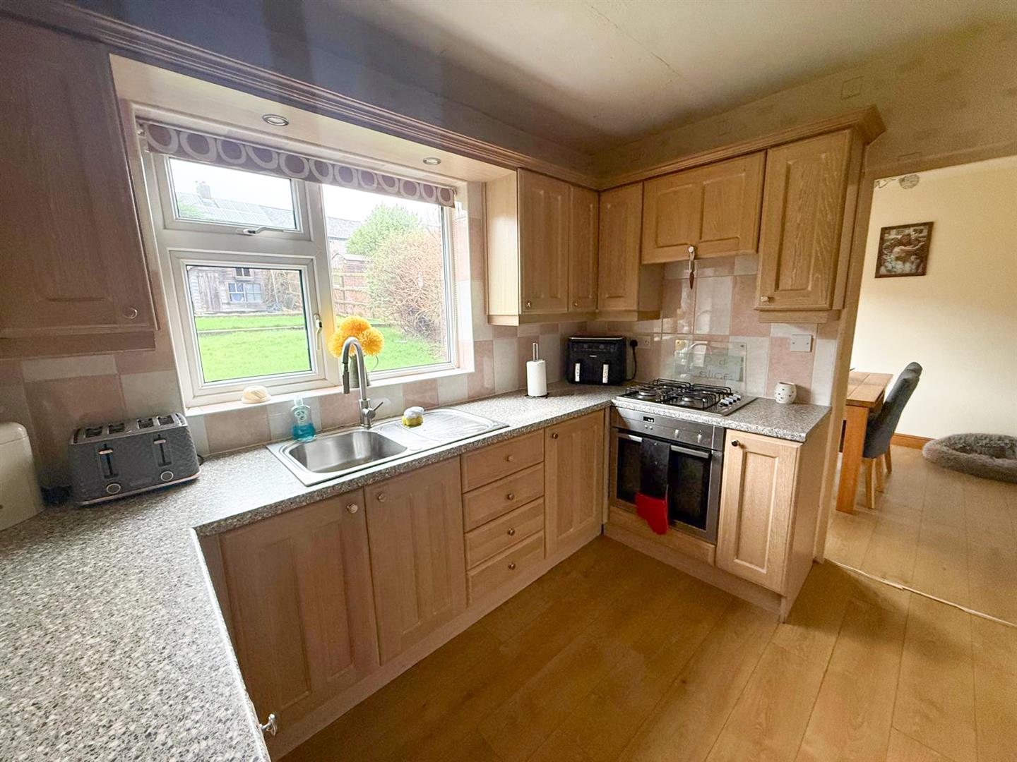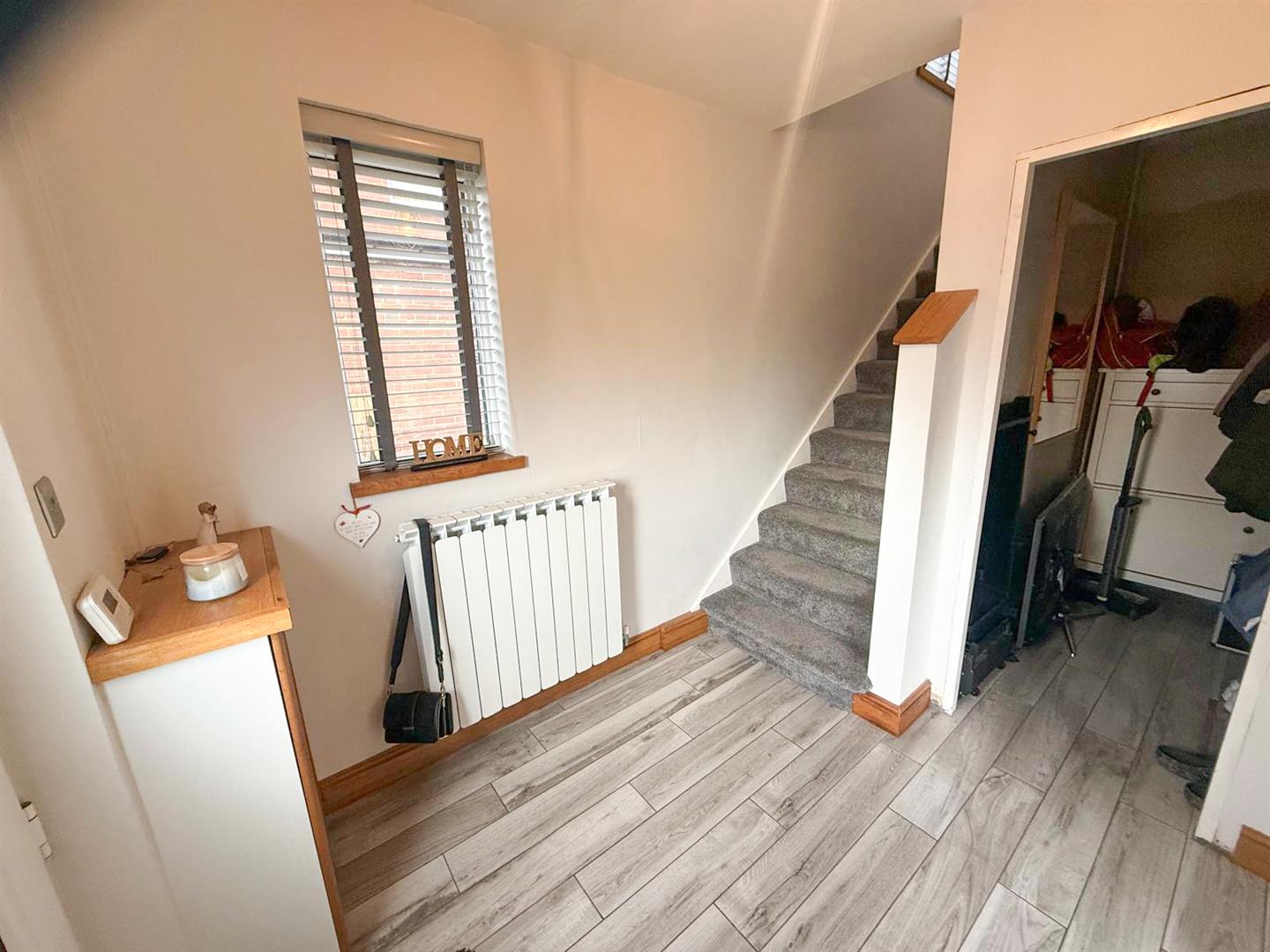 The home is accessed via a welcoming and spacious entrance hall, which leads to a practical walk-in boot room/cloakroom. An open staircase rises to the first floor, while the ground floor accommodation flows beautifully. The bright and inviting sitting room features a large bay window that floods the space with natural light and opens through to the dining room. The dining area, finished with wood-effect flooring and a stylish radiator, benefits from French doors that open directly onto the rear garden, creating an ideal space for family living and entertaining.